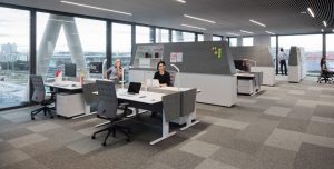 The work-friendly character is supported by acoustic attachments specially developed by Kinzo for the project: they absorb the resulting sound, zone the areas and can be personalized with an integrated shelf.