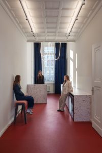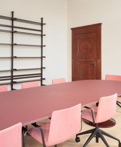A finely graded red runs through the space like a visual pulse. It stands for energy, vitality, and change—and makes it clear what drives the German Heart Center Foundation. Historical elements have been carefully exposed and combined with contemporary materials. The old archive shelf remains—reinterpreted as a statement of continuity. A greening concept by P2 Objektgrün provides lively accents.