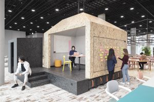 F21 has been opened to employees and in-house start-ups in 2019. The headquarters was completed in 2017 by David Chipperfield Architects in the city center of Seoul. Contrary to the more subdued interior of the other floors, Kinzo’s design of the 3,100 sqm of F21 relies on a mixture of raw elements and bold colors. The contrast between the dark grid ceiling and the floor of large plywood panels is a playful concept – one of the many contrasts that promote an open and creative working atmosphere.