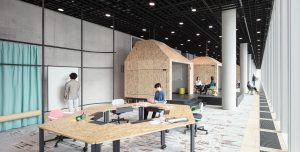 F21 has been opened to employees and in-house start-ups in 2019. The headquarters was completed in 2017 by David Chipperfield Architects in the city center of Seoul. Contrary to the more subdued interior of the other floors, Kinzo’s design of the 3,100 sqm of F21 relies on a mixture of raw elements and bold colors. The contrast between the dark grid ceiling and the floor of large plywood panels is a playful concept – one of the many contrasts that promote an open and creative working atmosphere.