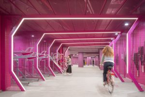 The design challenges were as manifold as the future vehicle fleet: the bike car park is completely underground and therefore had to be intuitive to use, robust and inviting at the same time. Kinzo have created a place where users feel safe and comfortable. Inspired by the cross-section of a bicycle tyre, the design reflects the geometry of the space and invites you to immerse yourself in another world.