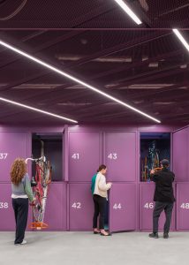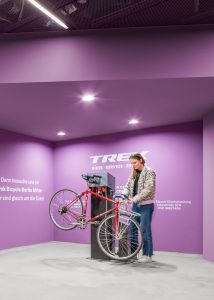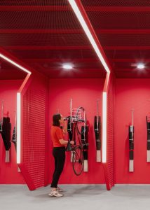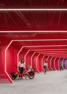 The design challenges were as manifold as the future vehicle fleet: the bike car park is completely underground and therefore had to be intuitive to use, robust and inviting at the same time. Kinzo have created a place where users feel safe and comfortable. Inspired by the cross-section of a bicycle tyre, the design reflects the geometry of the space and invites you to immerse yourself in another world.