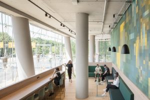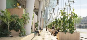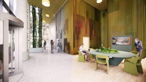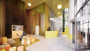 Another subproject further dissolves the boundaries between the urban space and the interior: both Lobby E spaces on Bellevue Street offer a view of the Forum, the heart of the Sony Center. The areas E1 and E2 feature strong character design approaches with high recognition value – for example, a wall covering of colored chain curtains, a massive community table and cozy lounge furniture. Completion is at the end of 2023.