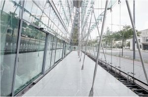 In addition to the design of various lobby areas, the construction measures commissioned also include the conversion of the Passerelle into a bicycle parking area: The new bike parking connects the Potsdamer Platz subway and S-Bahn station with the Forum in the Sony Center. The passageway offers space for over 200 bicycles (including e-bikes and cargo bikes) and is to be used daily by commuters, employees, residents and visitors. Completion is planned for 2023.