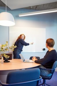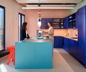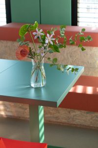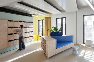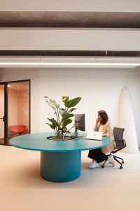 The design concept of Kinzo is characterised by bright and vibrant colours combined with natural wood elements, which create a cosy working atmosphere overall.