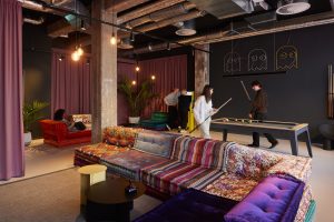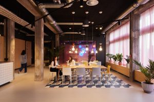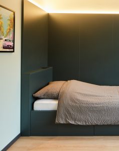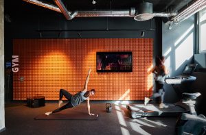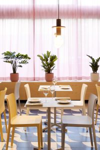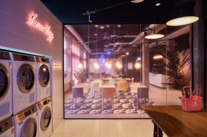 For the guests, who are spread over 7 floors, there are also opportunities to meet in the gaming room or do sports together in the fitness room. A special solution is the laundry room with colored glass right next to the restaurant area.