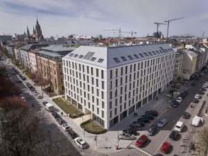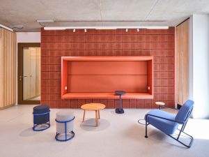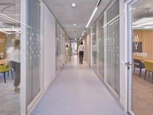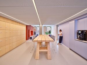 Right next door, in the coffee kitchen, stands a true colossus: the wooden table. It invokes a traditional carpenter’s workbench, but due to its over-sized proportions and challenging beam thickness, could only be realized by a stair builder.