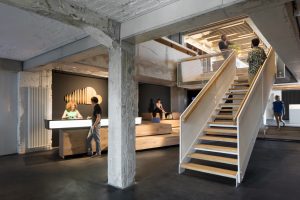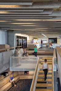 The sound wave “Hello, Welcome to Soundcldoud” was included in abstracted form as ceiling baffles.