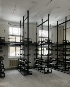 Spanning approximately 800 m², the space features work, research, and collaboration areas for 20 employees that blend openness with structure: communicative spaces with flexible layouts designed for interdisciplinary dialogue, such as the former lecture hall with its integrated LED wall, the former archive with custom-built fixtures that comply with historic preservation regulations, and the open kitchen, which serves as a social hub. Clearly defined zones for focused work complement the space.
