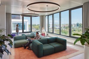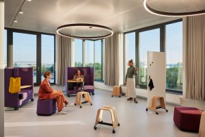 Das Konzept impliziert eine nicht-hierarchie- und bereichsübergreifende Flächennutzung – ob Vorstand oder Referent:in, alle finden einen Platz in der offenen Bürolandschaft für eine gute Zusammenarbeit, mehr Begegnung und besseren Wissensaustausch.