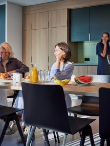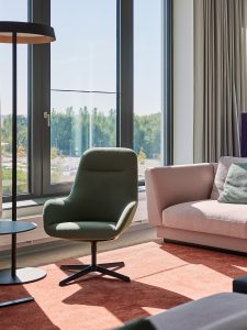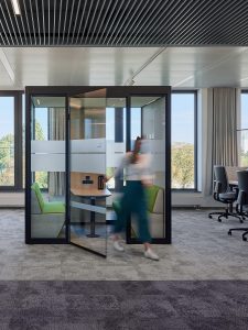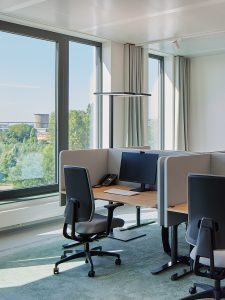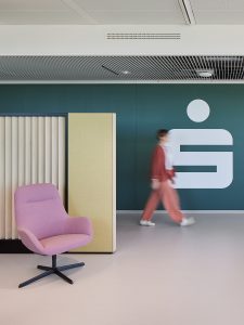 Das Konzept impliziert eine nicht-hierarchie- und bereichsübergreifende Flächennutzung – ob Vorstand oder Referent:in, alle finden einen Platz in der offenen Bürolandschaft für eine gute Zusammenarbeit, mehr Begegnung und besseren Wissensaustausch.