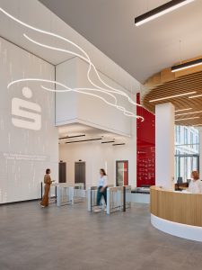 Dieser einladende Charakter entfaltet sich bereits im Eingangsbereich, wo Besucher:innen von einer zweiteiligen, dynamischen und wellenförmigen Lichtinstallation empfangen werden – entworfen von Susanne Philippson und Kinzos Senior Projekt Architektin Eliana Martinis.