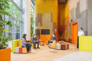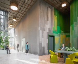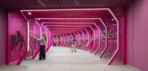 Die beauftragten baulichen Maßnahmen umfassen neben der Gestaltung verschiedener Lobbybereiche auch den Umbau der Passerelle zum Fahrradparkplatz: Das neue Bike Parking verbindet den U- und S-Bahnhof Potsdamer Platz mit dem Forum im Sony Center. Der Durchgang bietet Platz für über 200 Fahrräder (inkl. E-Bikes und Lastenräder) und soll täglich von Pendler:innen, Mitarbeitenden, Anwohner:innen und Besucher:innen genutzt werden.