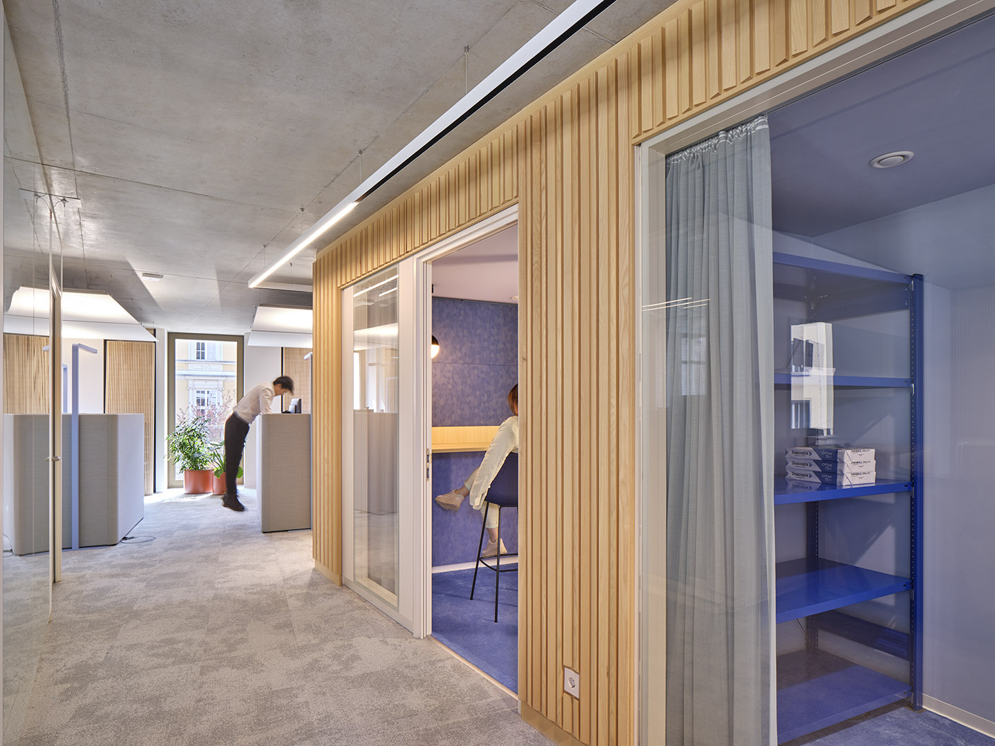 Im We-Space steht mit dem hölzernen Tisch ein wahrer Koloss. Er zitiert die klassische Schreiner-Werkbank, konnte aber aufgrund seiner aufgeblasenen Proportionen und der herausfordernden Balkenstärke nur vom Treppenbauer realisiert werden.