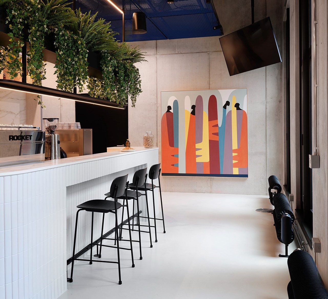 Der neue, von Kinzo realisierte Münchner Standort von dem vertraulichen Tech-Client erstreckt sich über drei Etagen und belegt 570 Quadratmeter im Erdgeschoss, 2.500 Quadratmeter im dritten und 2.100 Quadratmeter im vierten Obergeschoss. Dabei dominieren zwei Nutzungen: Im EG und in Teilen des 3. OG gibt es große teilöffentliche Flächen, die der Zusammenarbeit mit den Kund:innen gewidmet sind.