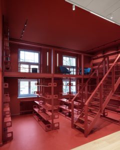 Auf rund 800 m² entstanden für 20 Mitarbeitende Arbeits‑, Forschungs‑ und Austauschflächen, die Offenheit und Struktur verbinden: kommunikative Bereiche mit flexiblen Raumstrukturen für interdisziplinären Dialog, wie der alte Hörsaal mit integrierte LED‑Wand, das ehemalige Archiv mit maßgefertigten und dem Denkmalschutz folgenden Einbauten oder die offene Küche als sozialer Mittelpunkt. Klar zonierte Zonen für fokussiertes Arbeiten ergänzen die Fläche.
