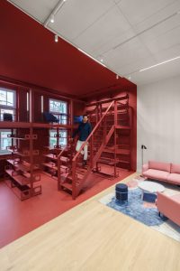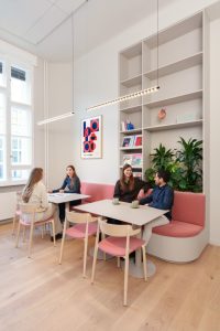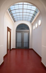 Ein fein abgestuftes Rot zieht sich wie ein visueller Puls durch die Fläche. Es steht für Energie, Lebendigkeit und Wandel – und macht spürbar, was die Stiftung Deutsches Herzzentrum antreibt. Historische Elemente wurden behutsam freigelegt und mit zeitgemäßen Materialien kombiniert. Das alte Archivregal bleibt – neu interpretiert als Statement für Kontinuität. Ein Begrünungskonzept von P2 Objektgrün sorgt für lebendige Akzente.