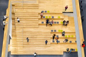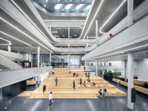 HENN und Kinzo konzipierten in einem gemeinsamen Entwurf für das Zalando Headquarters eine Art veredelten Rohbau. Das Interior des Gebäudes unweit der East Side Gallery und des Berghain ist geprägt von der vielschichtigen Heimatstadt des jungen Berliner Unternehmens.