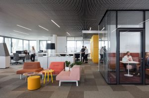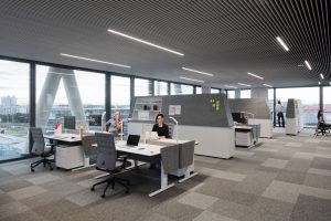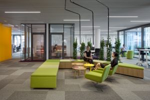 Unterstützt wird der arbeitsfreundliche Charakter durch speziell von Kinzo für das Projekt entwickelte Akustikaufsätze: sie absorbieren den anfallenden Schall, zonieren die Bereiche und lassen sich durch ein integriertes Regal personalisieren.